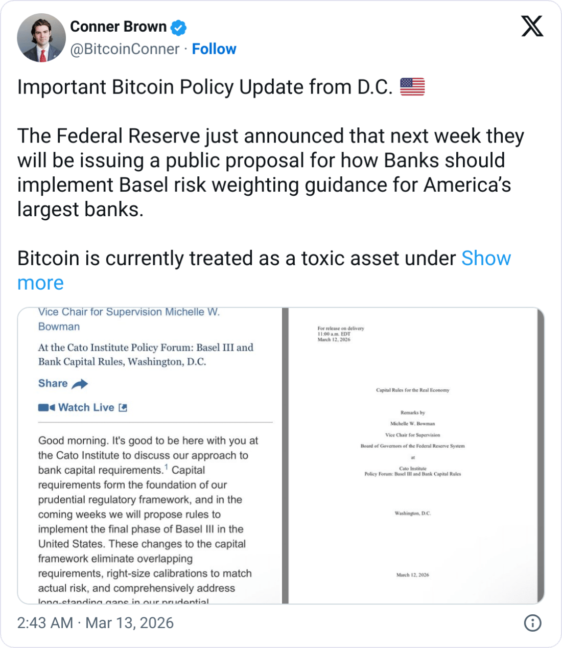 «BPI vil gjennomgå dette forslaget nøye og sende inn en offentlig høringsuttalelse for å sikre at amerikanske reguleringsmyndigheter får behandlingen av Bitcoin riktig», – uttalte «Bitcoin Policy Institute»s daglige leder Conner Brown i et innlegg på X onsdag.